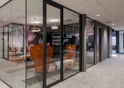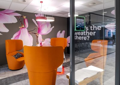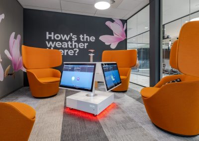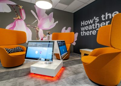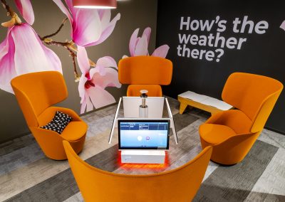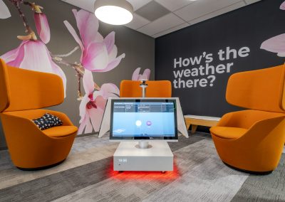 Deze ruimte dient om elkaar op een minder formele manier te ontmoeten, ter plaatse en remote, door de huiselijke sfeer en comfortabele stoelen.
